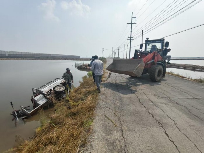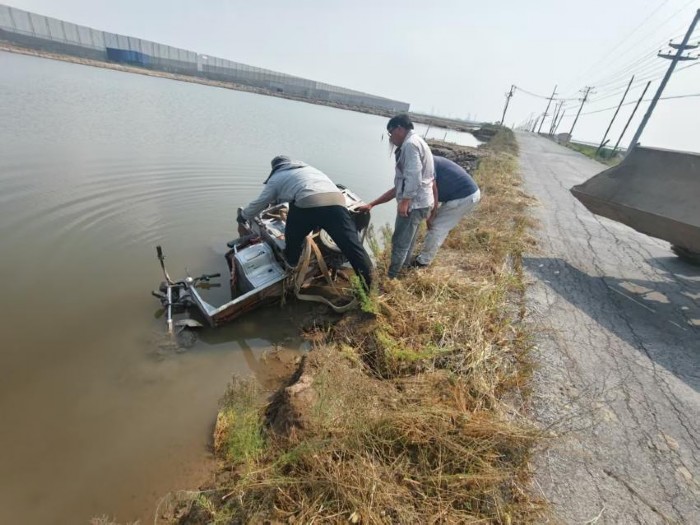 上午10時(shí)左右,海豐鎮(zhèn)村民駕駛?cè)嗆囃窘?jīng)建筑工程公司東側(cè)路段時(shí),因避讓車輛造成三輪車失控,連人帶車沖入路北的水中。三輪車落水后迅速傾斜下沉,情況危急,村民大聲呼救。