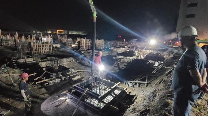 8月3日晚,建筑工程有限公司在鳴岐化工項(xiàng)目的施工現(xiàn)場一片忙碌。為搶抓施工黃金期,避開日間高溫影響,同時(shí)趕在大雨來臨前推進(jìn)關(guān)鍵節(jié)點(diǎn),項(xiàng)目部科學(xué)統(tǒng)籌,利用晚間進(jìn)行施工作業(yè),集中澆筑罐區(qū)-罐組及泵棚基礎(chǔ)混凝土,總量達(dá)160立方。